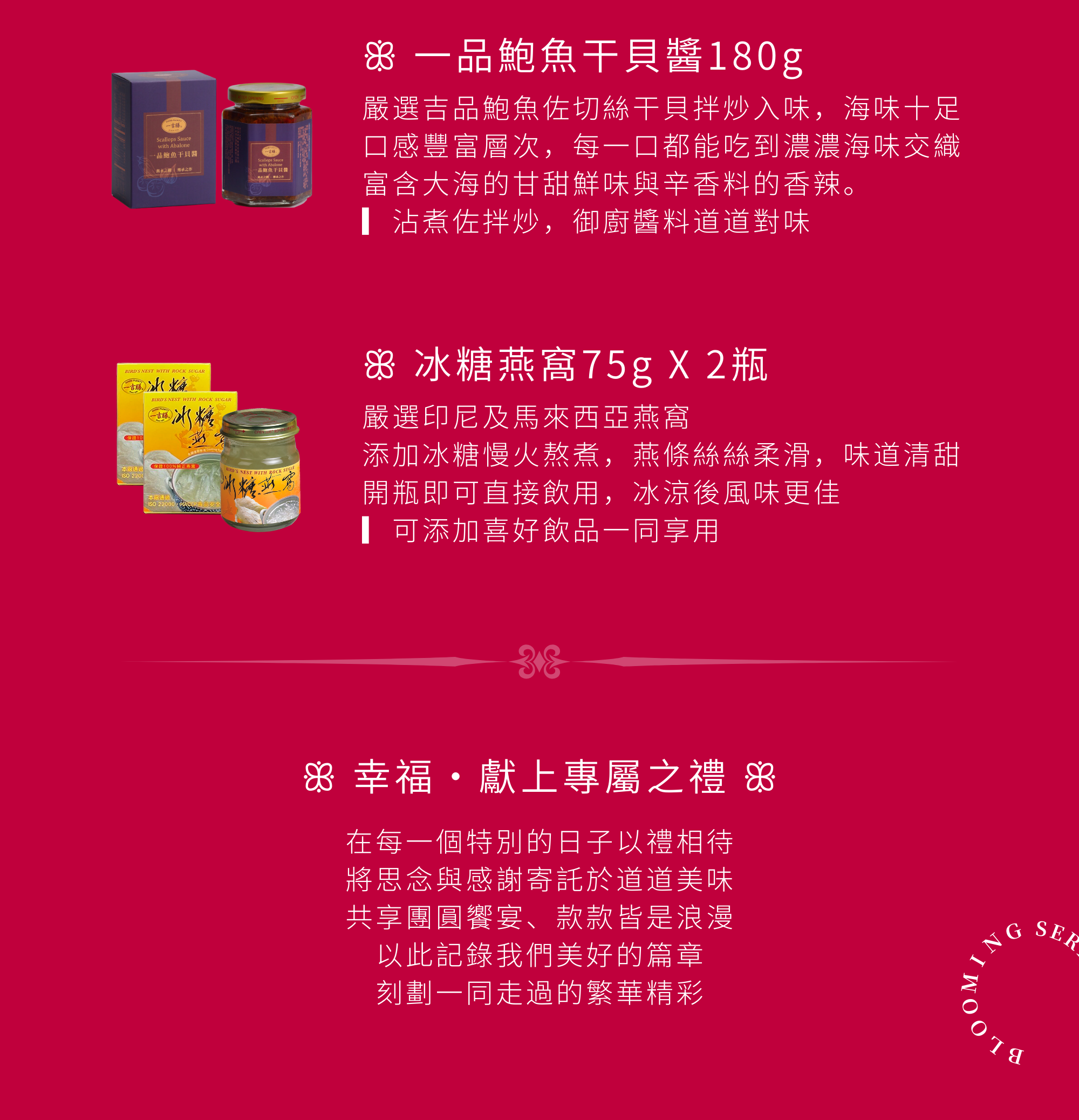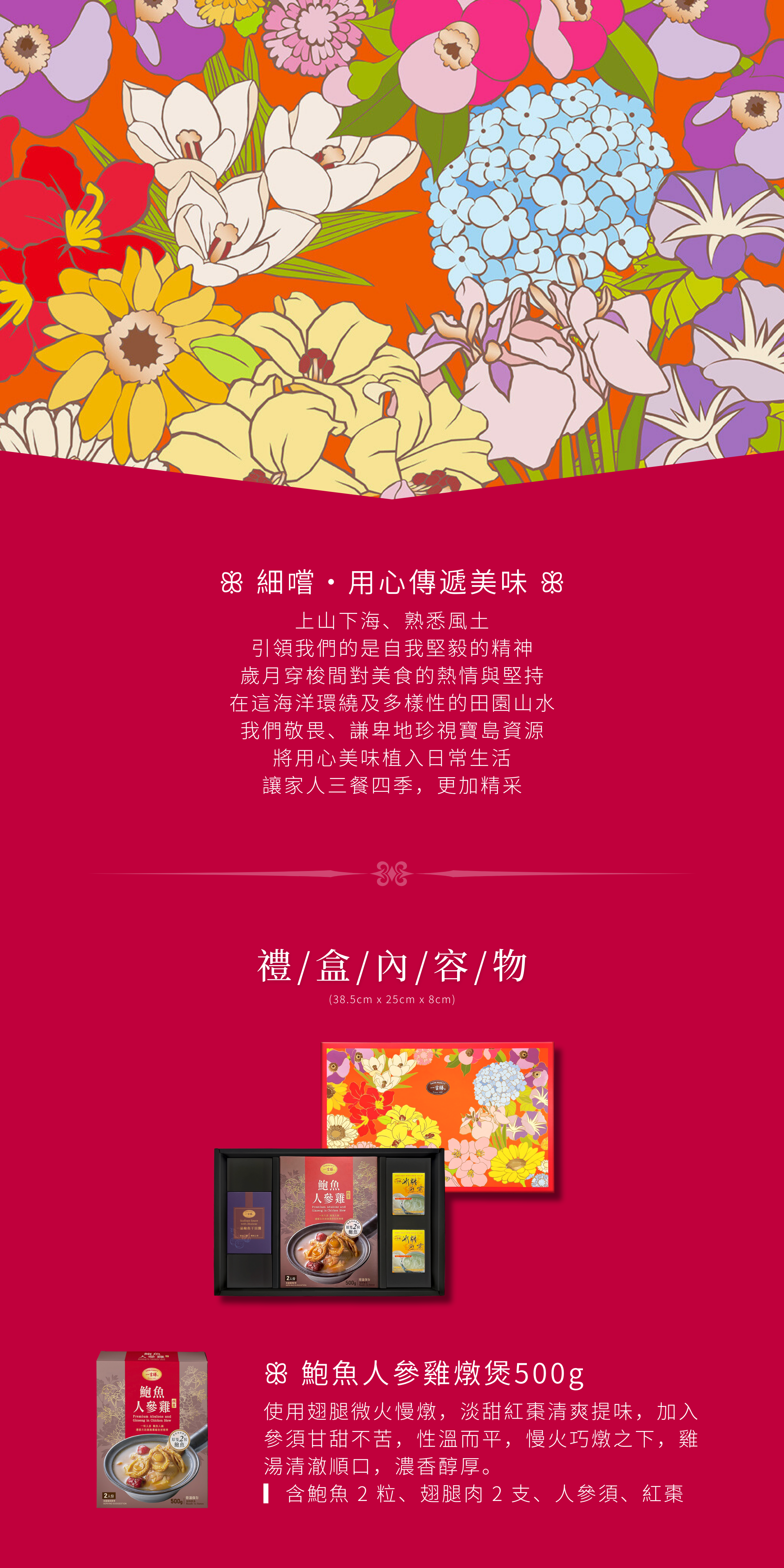 ▎禮盒內容物:鮑魚人參雞燉煲500g+一品鮑魚干貝醬180g+冰糖燕窩75g*2入,附贈品牌提袋乙個