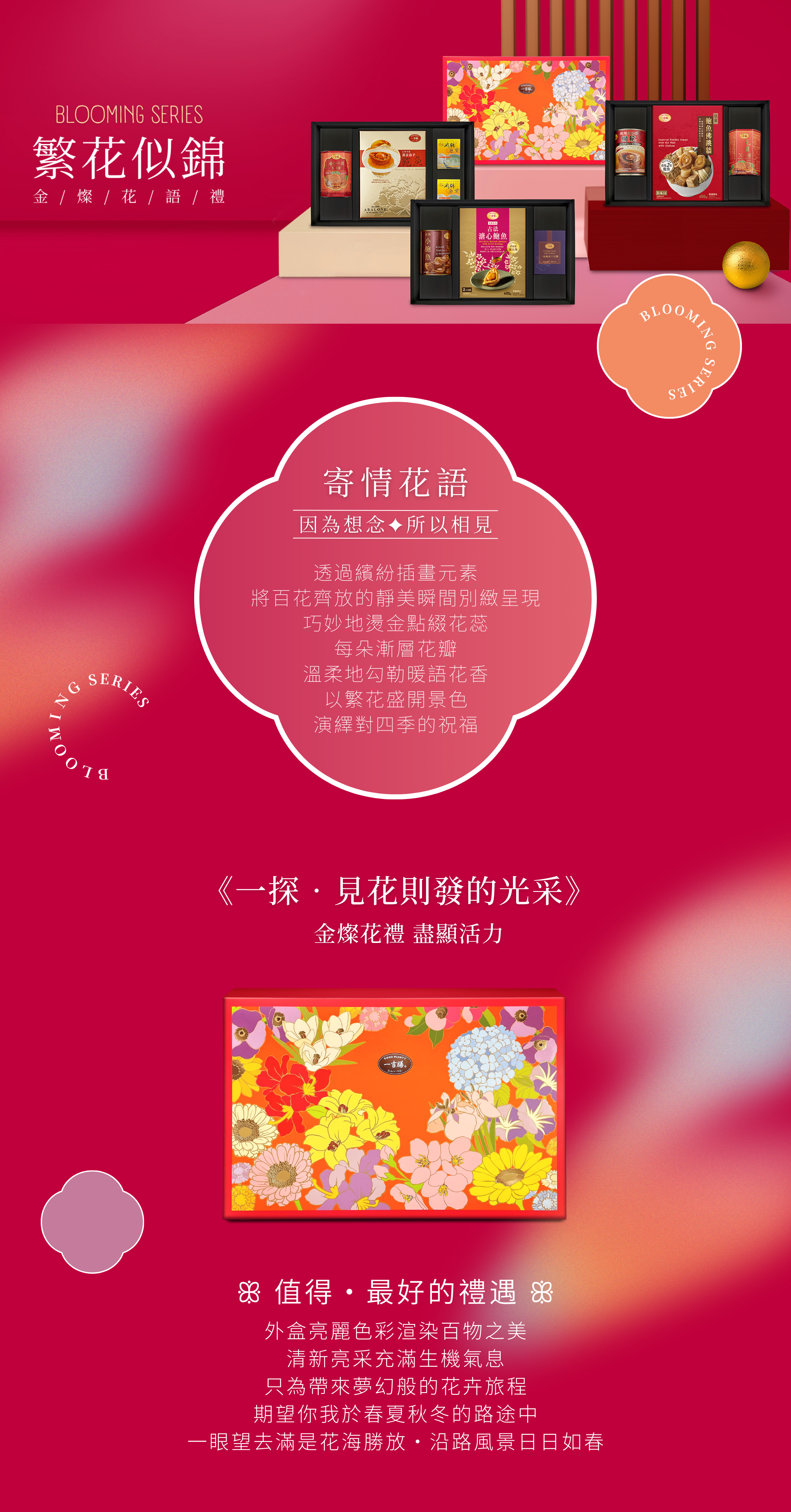 【繁花似錦禮盒】透過繽紛插畫元素將百花齊放的靜美瞬間別緻呈現,巧妙地燙金點綴花蕊,每朵漸層花瓣溫柔地勾勒出暖語花香,以繁花盛開的景色演繹對四季的祝福,亮麗的色彩渲染百物之美,期望你我於春夏秋冬的旅程中,一眼望去滿是花海勝放,沿路風景日日如春,在每一個特別的日子以禮相待,記錄我們美好篇章與一同走過的繁華精彩。