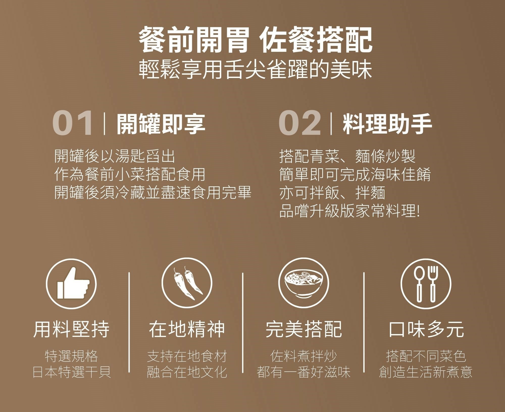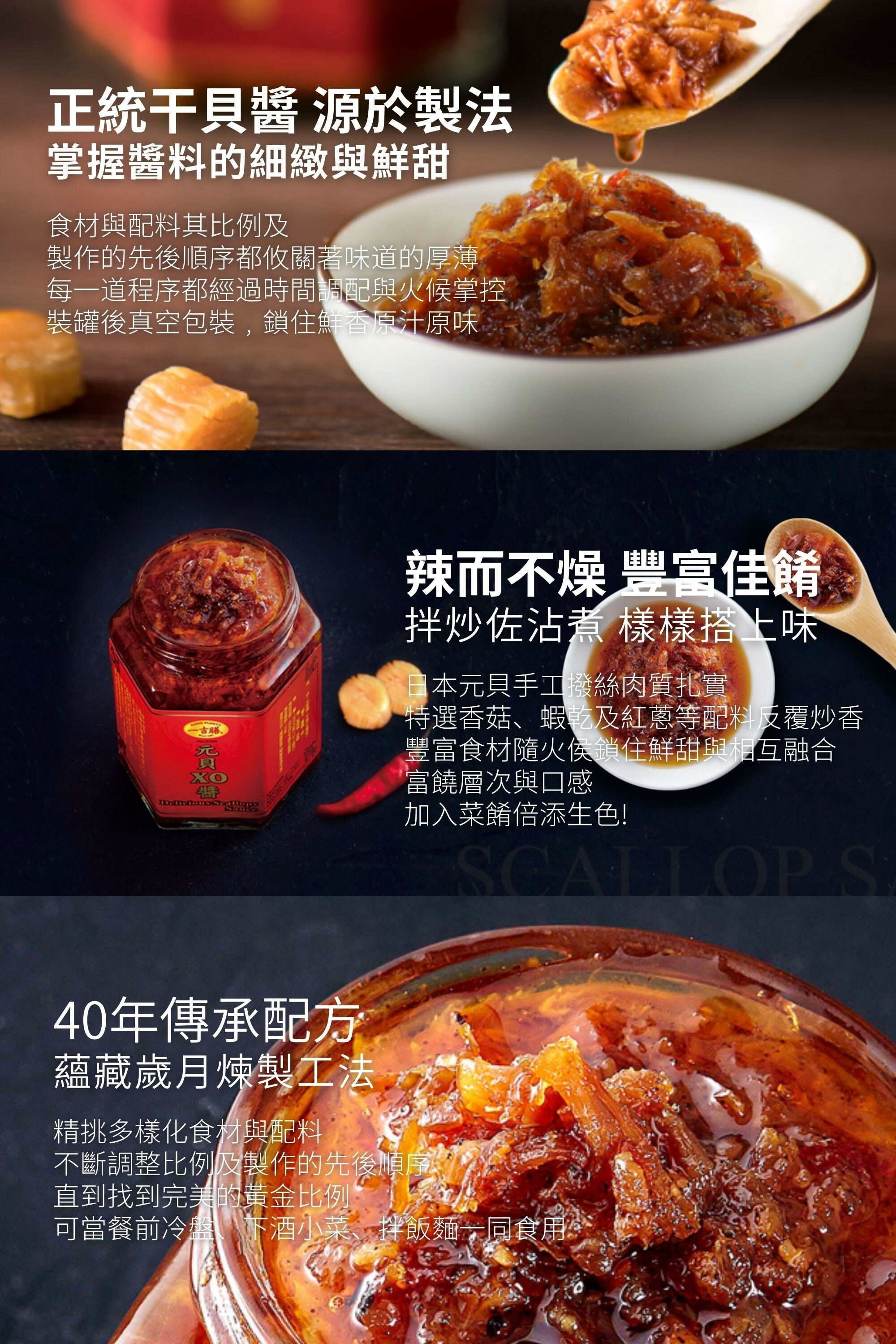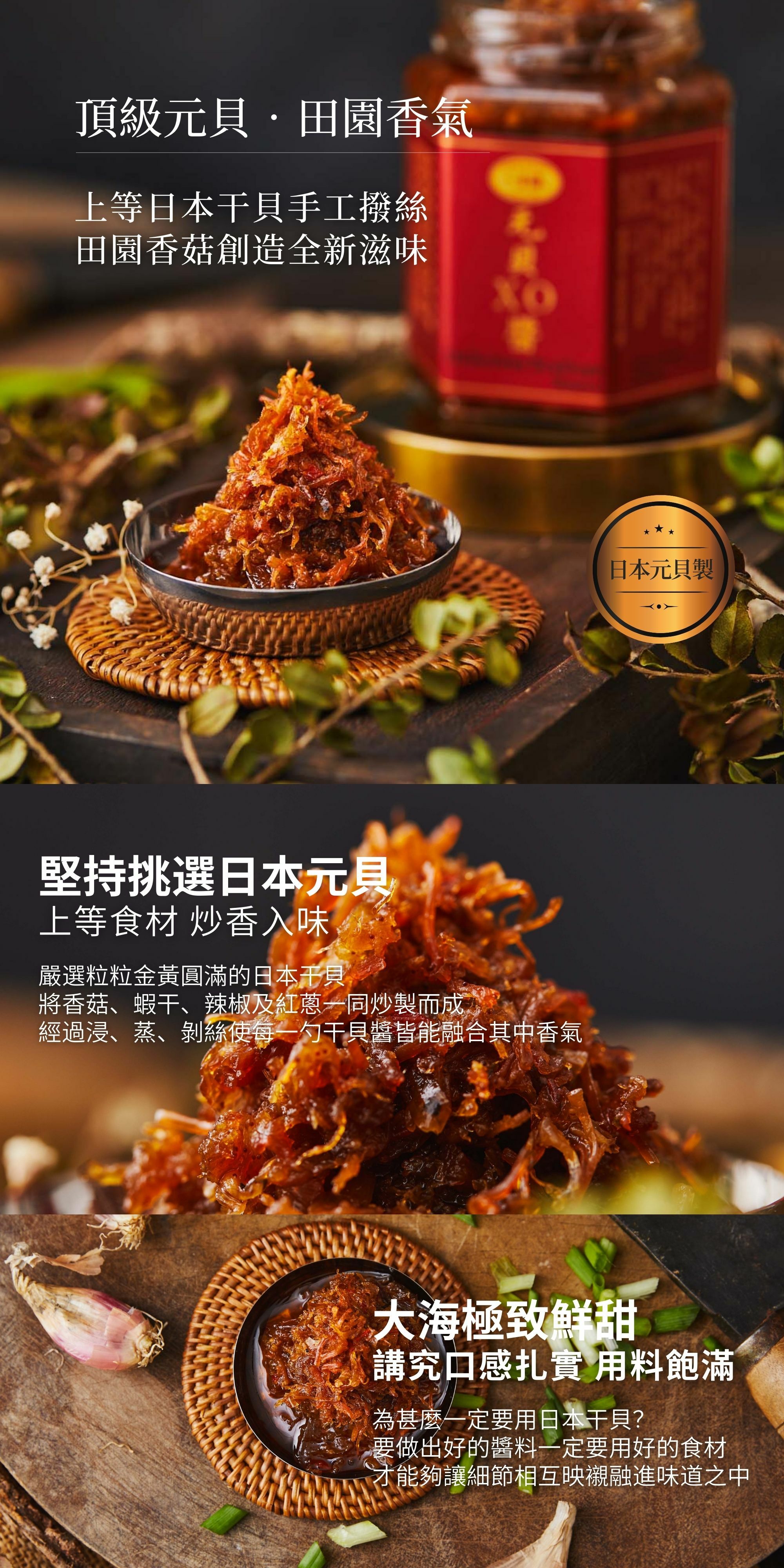 選用純正元貝、蝦干、香菇等上選食材精心製成,豐富配料搭配田園鮮香,口口都能享受到微辣滋味,經過浸、蒸、撥絲使每一口干貝絲都能融合食材香氣,每一道程序、時間調配與火候掌控都攸關著味道的厚薄,從入口回香到體驗真材實料,風味獨特,口感絕佳!