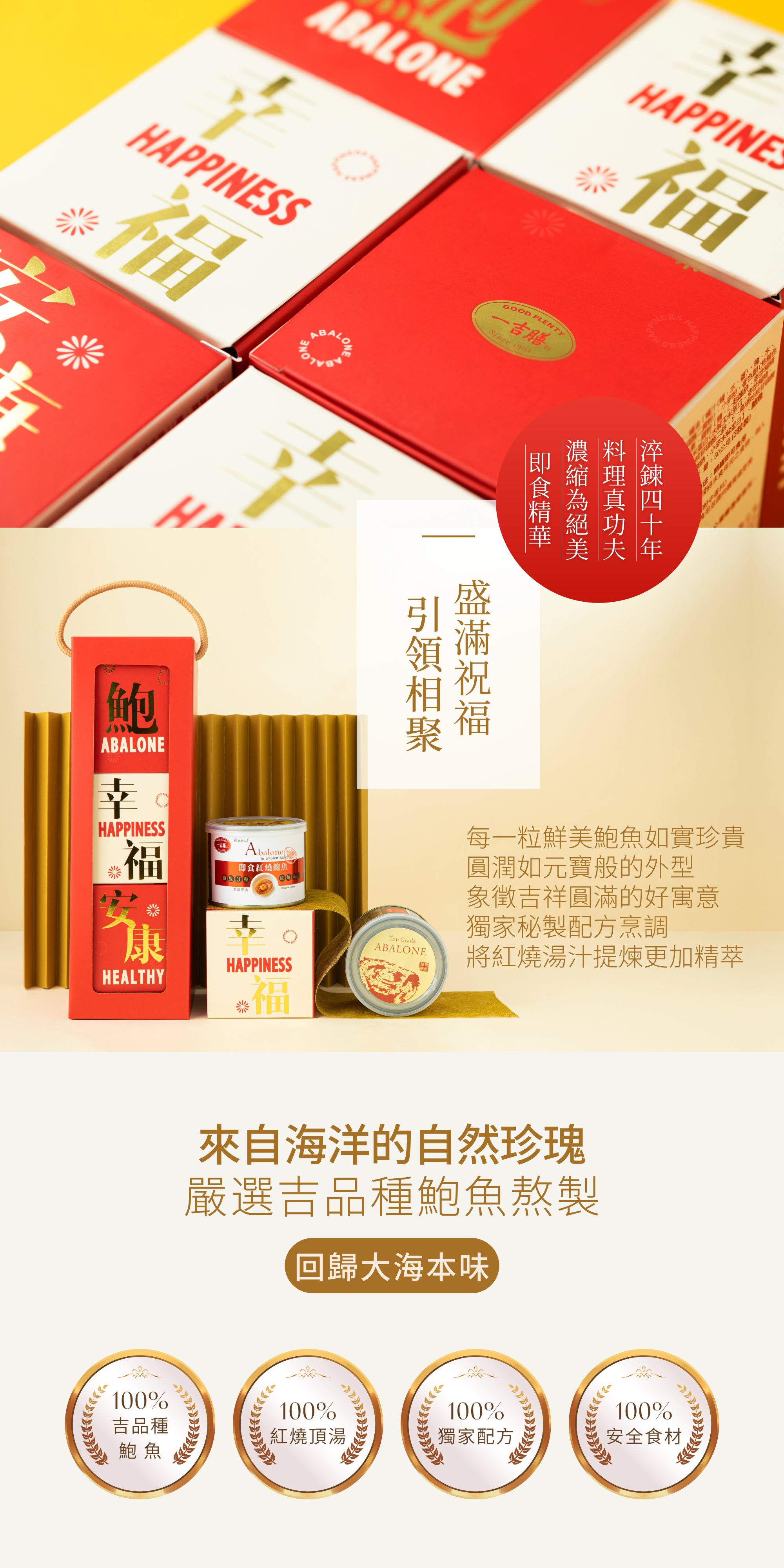 一吉膳推出限定版《真情食味》即食紅燒鮑魚禮盒,細緻挑選彈韌Q滑鮑魚熬製醇厚紅燒濃湯,藉以每一口香濃滋味鮑魚傳遞真情,象徵著以食連結人情歲月的流動與美好,我們將祝福裝進盒子裡,希望珍視的人都能日日幸福、日日安康。