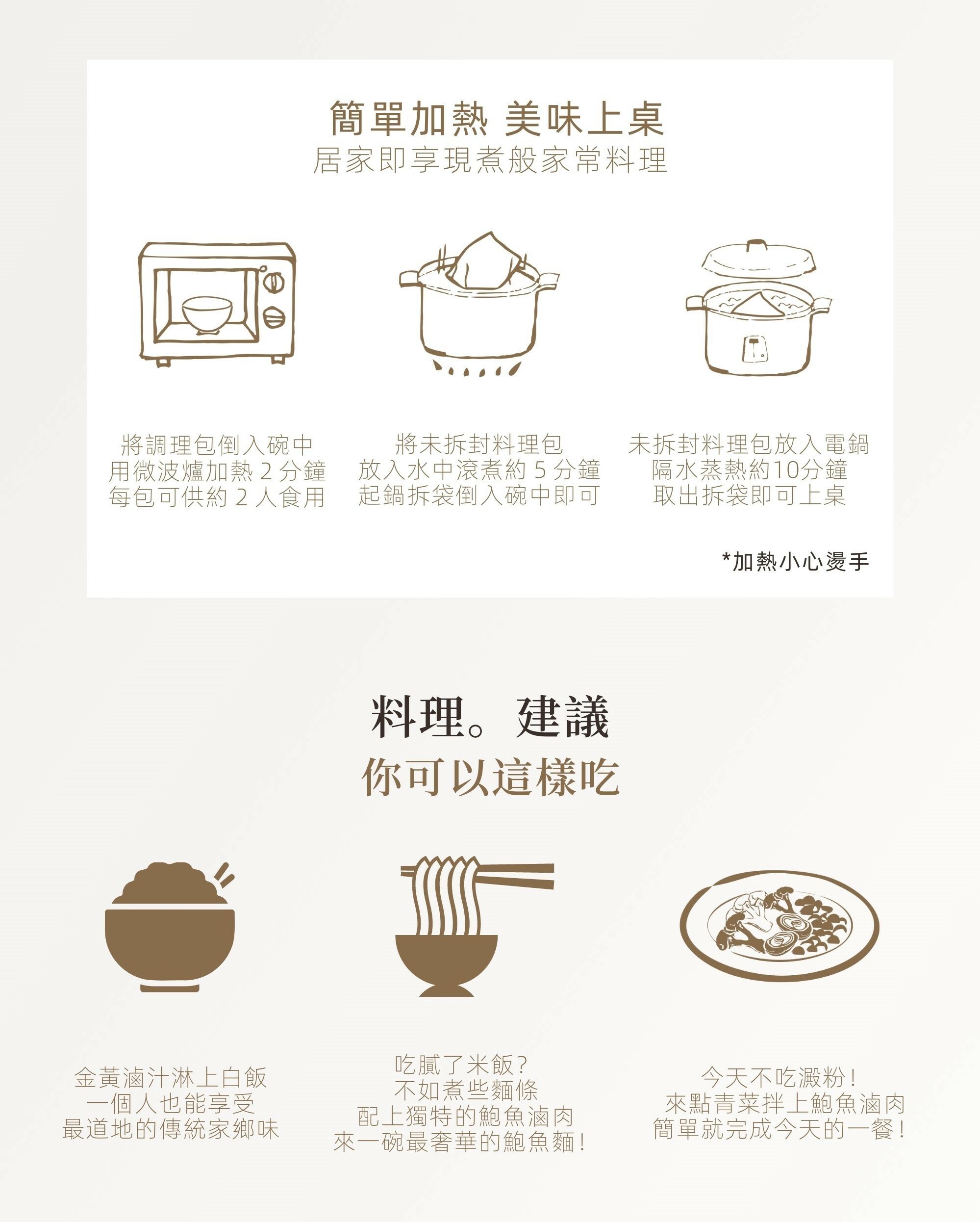 嚴選肥瘦黃金比例豬肉,以原汁原味傳統滷肉結合頂級彈牙小鮑魚、香菇、紅蔥一同入滷,黃金滷汁濃香甘鹹,淋上米飯、麵條,把家的味道細細還原,簡單就能品嚐懷舊滋味,為日常料理增添一番主廚高級感。