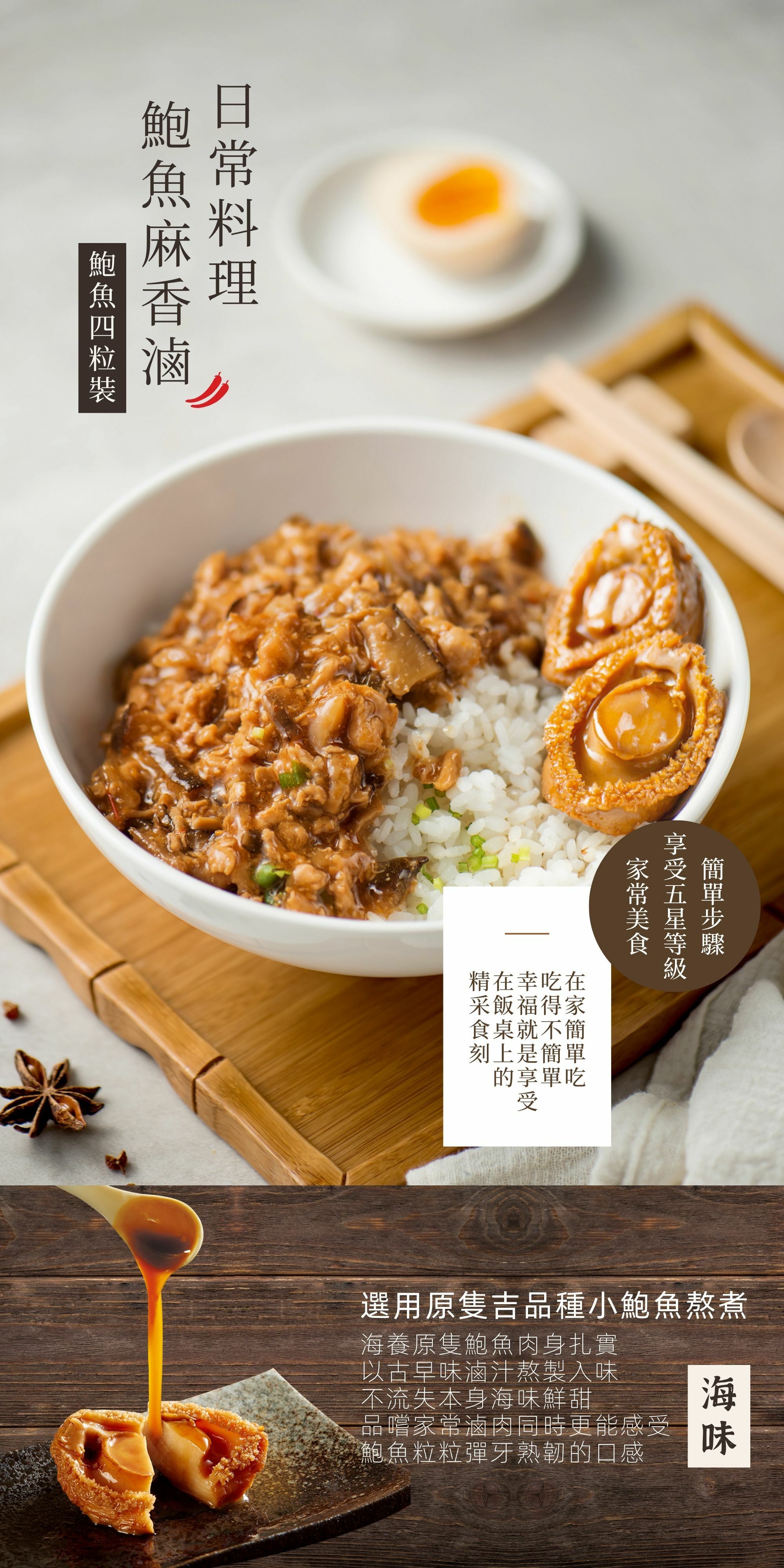 選用肉質扎實雞肉入滷,添加花椒提煉麻香,入口麻而不辣喉嚨,搭配鮑魚入滷汁熬煮,並與香菇、紅蔥及些許蠔油一同小火入味,順口而不油膩,釋放濃醇的鮮香。適合拌米飯、麵條一同食用,口感豐富,只要5分鐘即可輕鬆享用一餐,以高級食材融入古早家鄉味,適合小家庭或個人居家享用。