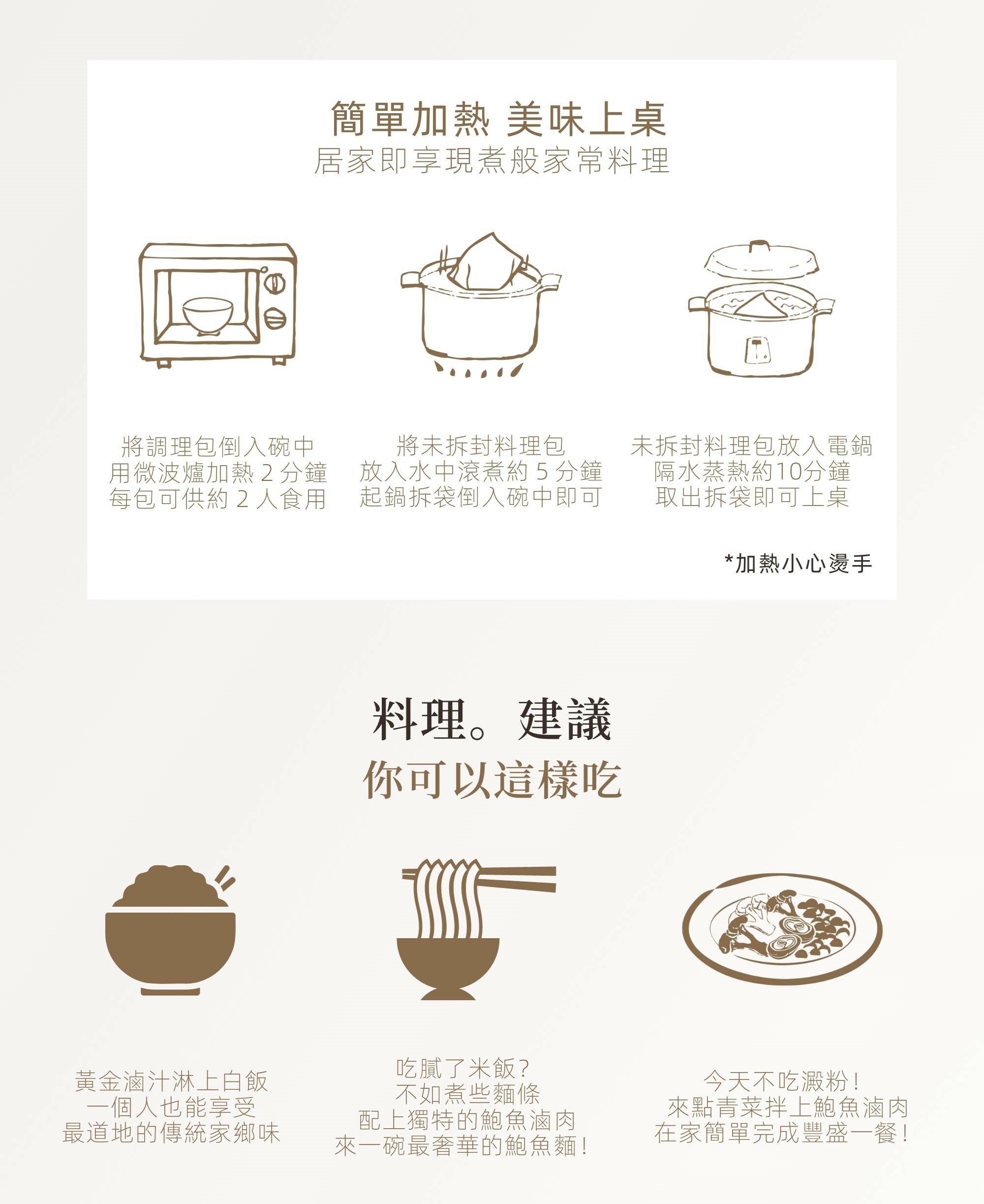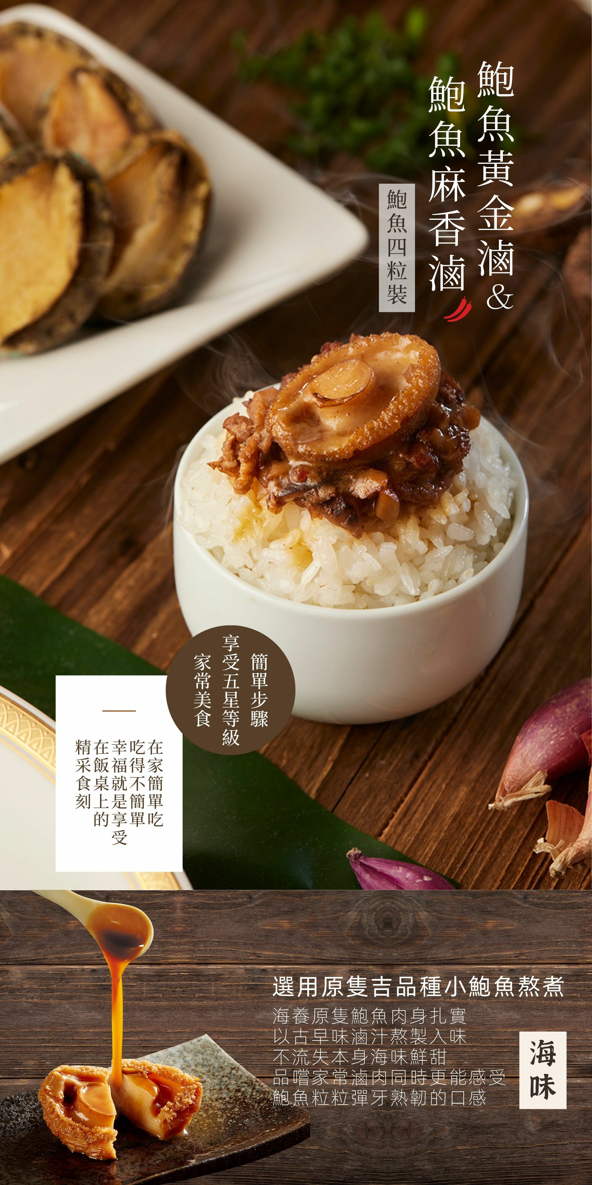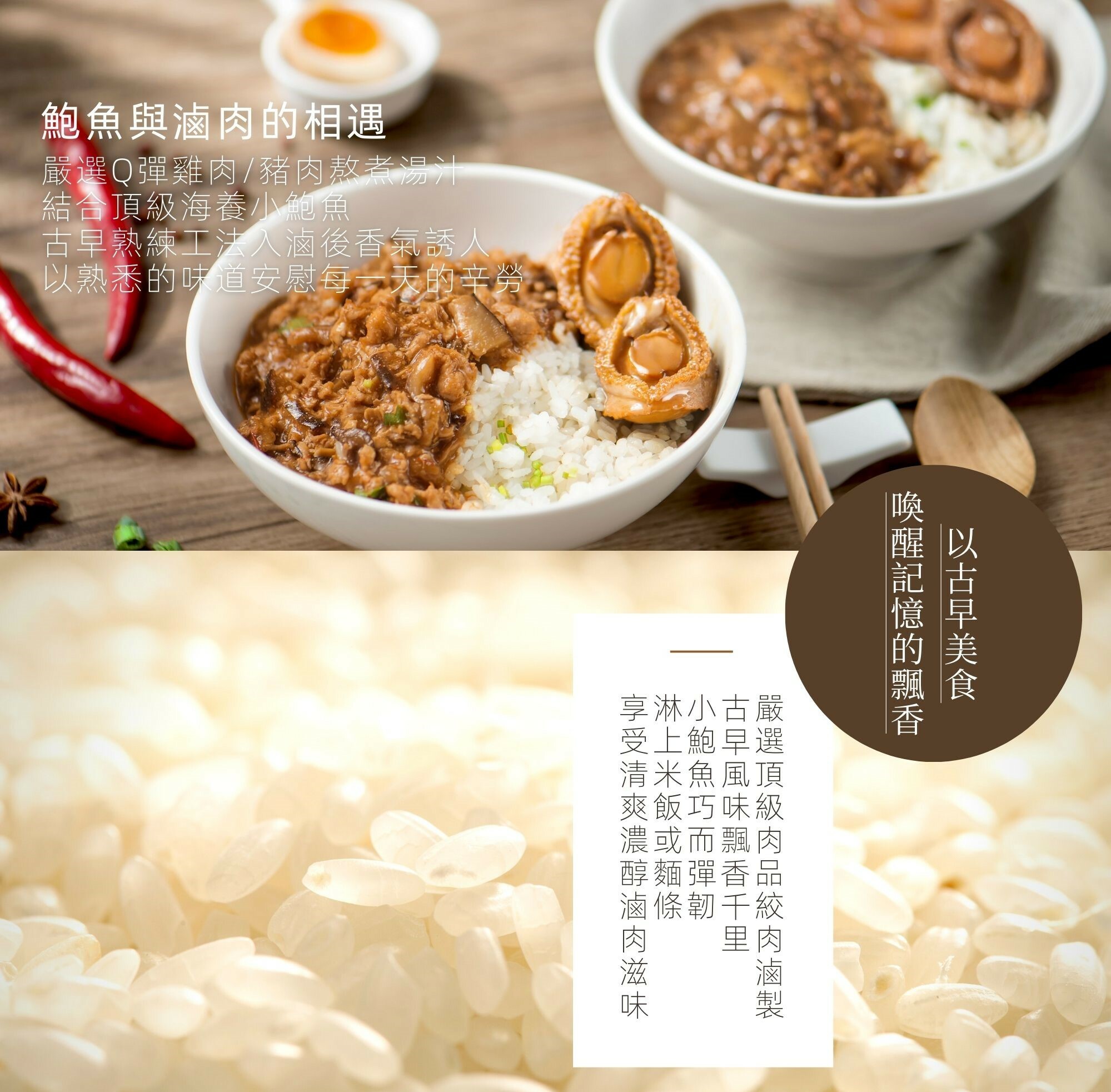 嚴選肥瘦黃金比例豬肉,粒粒圓潤飽滿鮑魚入煮原汁原味傳統滷肉,鮑魚肉質彈牙滑韌,一口咬下,大海鮮甜呼之欲出。