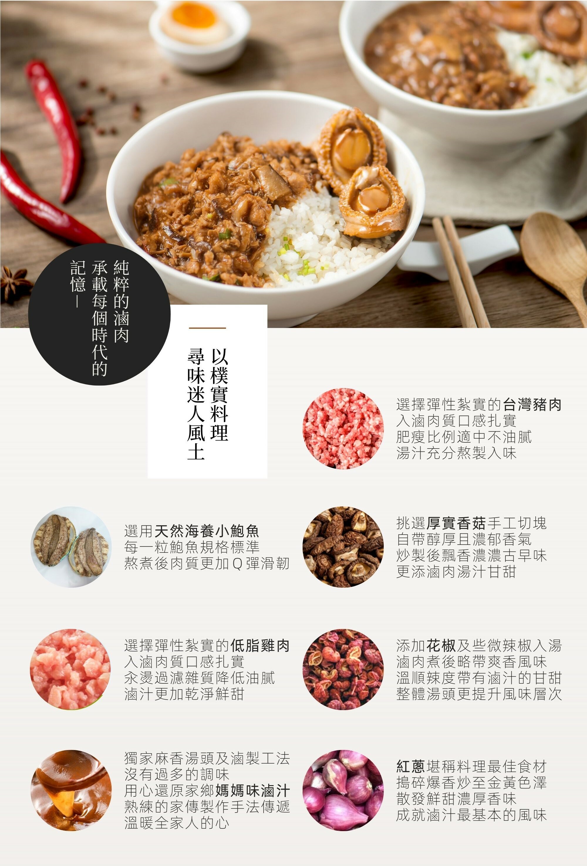 麻香滷肉麻而不辣喉嚨,搭配鮑魚入滷汁熬煮,加入嚴選雞肉與香菇、紅蔥及些許蠔油一同小火入味,喚醒古早味滷肉的記憶味蕾。