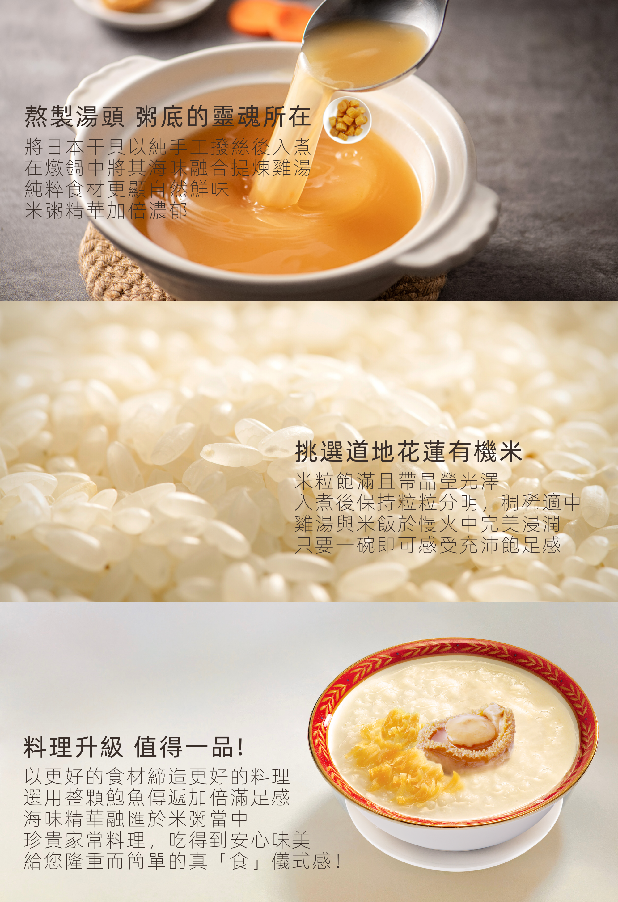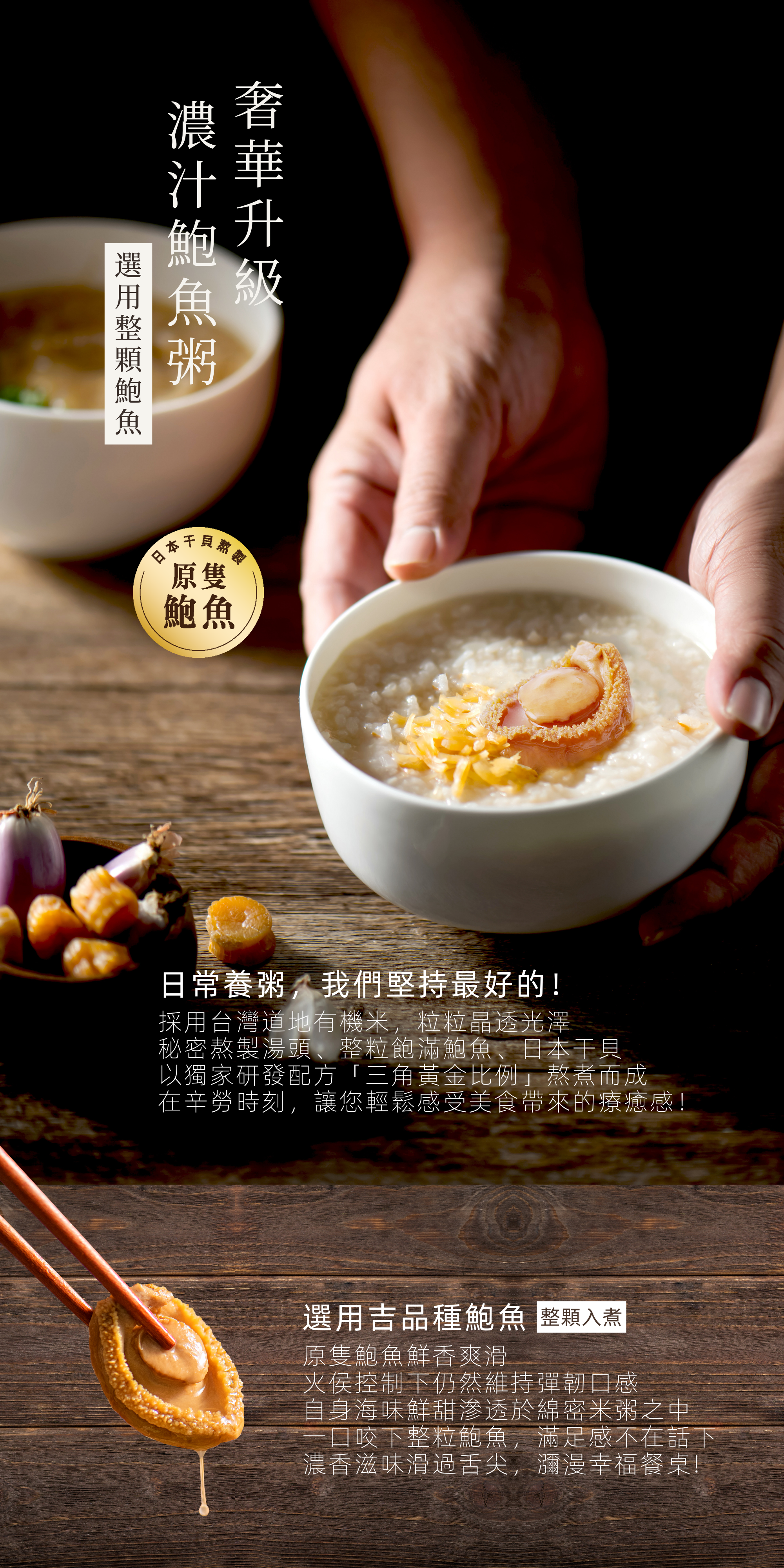 ▎一吉膳推出純正鮑魚「原隻呈現」,選用整顆鮑魚入米飯熬煮,添加日本干貝與鮑魚汁慢火熬出精華,濃稠米粒與豐富海味交織融合,回歸食材天然滋味,加熱後鮮香四溢,每日三餐,給您與家人最便利的四季陪伴。