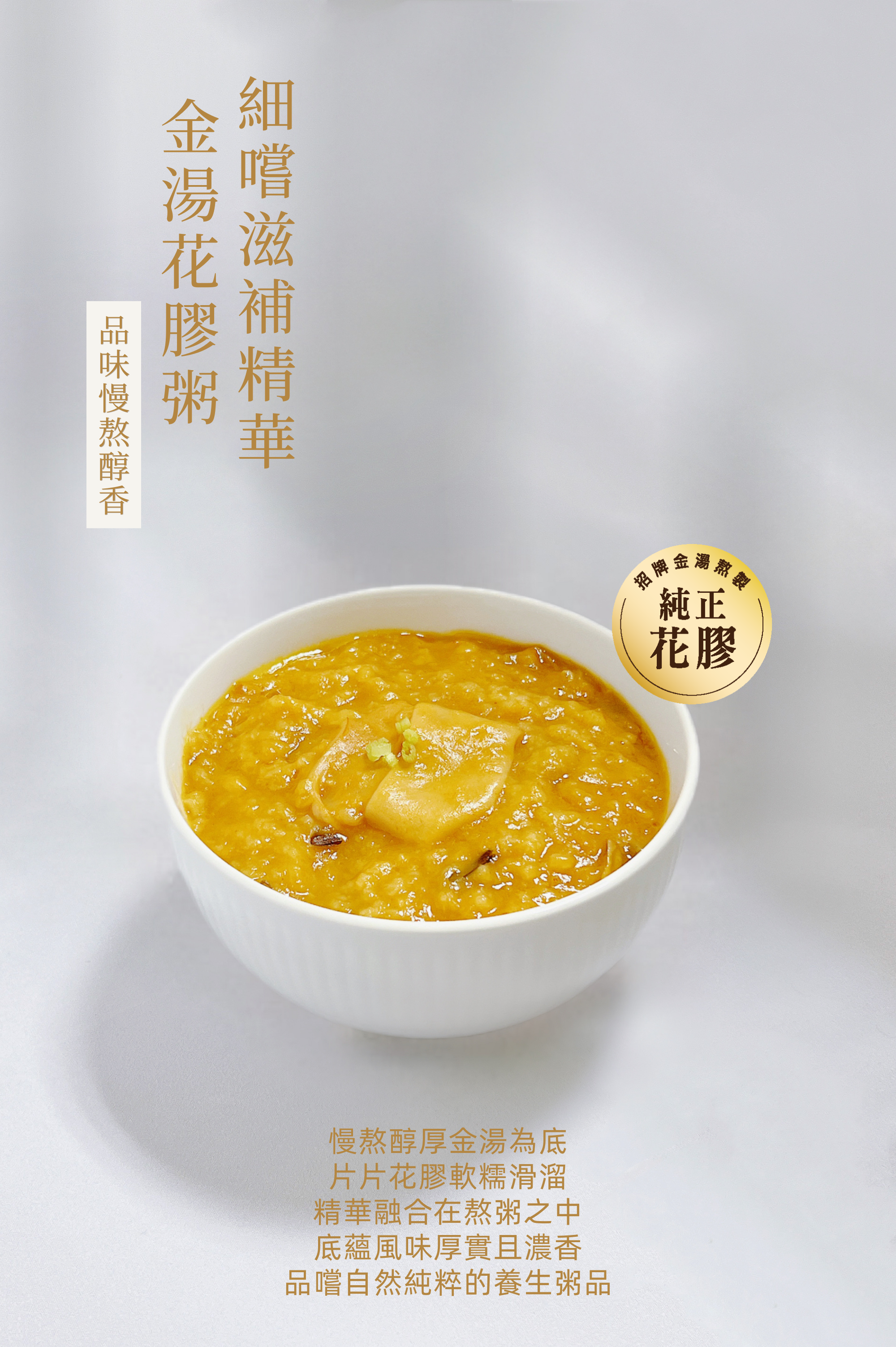 ▎即食金湯花膠養粥品,深受女性喜愛的養顏花膠熬燉入粥,醇濃南瓜慢熬野米,瑤柱鮮香入味,片片花膠軟糯滑溜,精華融合在熬粥之中,底蘊風味厚實濃香,品嚐自然純粹的養生粥品,加熱即享,四季皆宜!