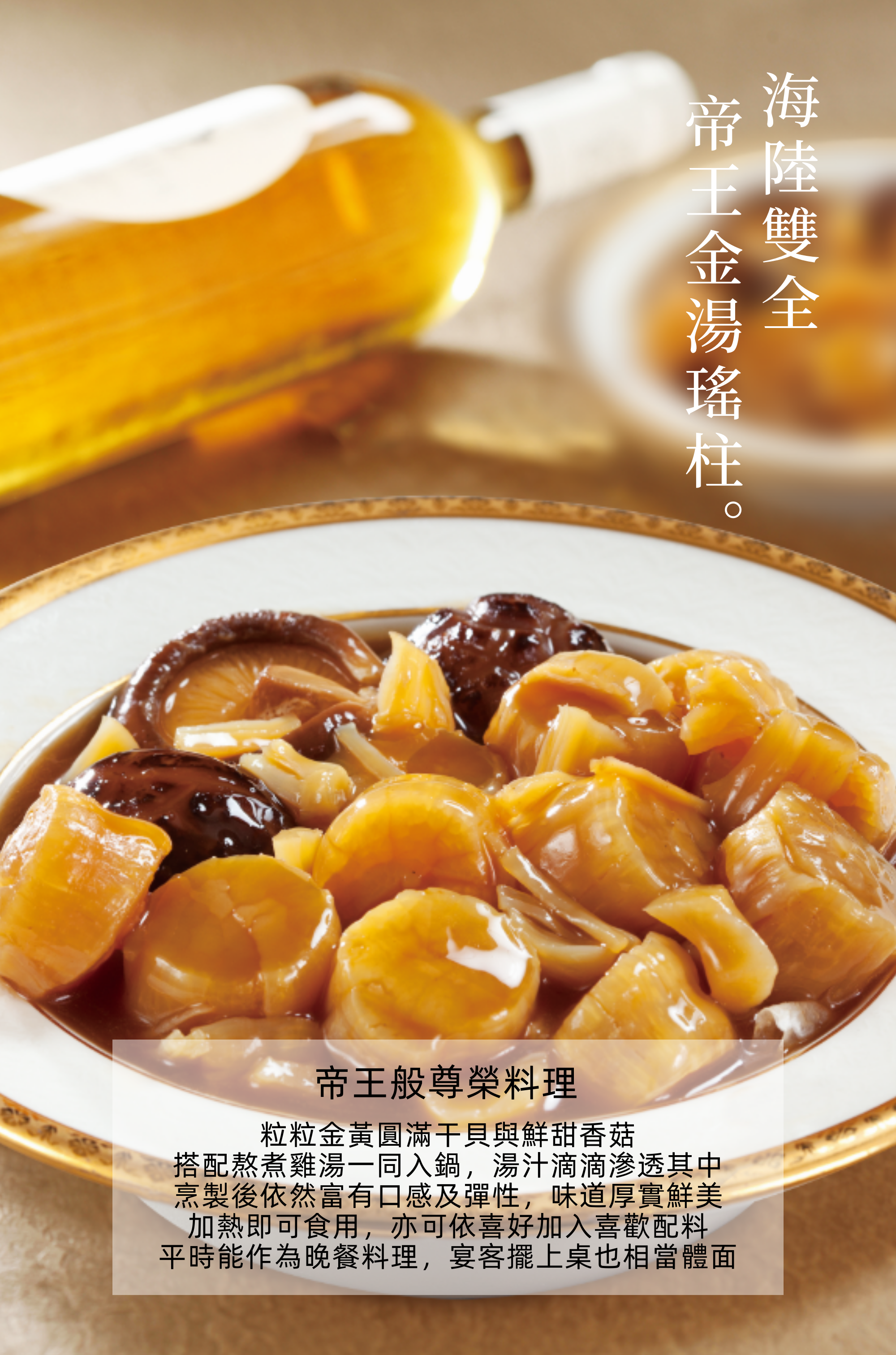 .帝王金湯瑤柱:選用粒粒金黃圓滿干貝與鮮嫩花菇,長時熬煮雞湯一同入鍋,湯汁滴滴滲透其中,加熱即可食用,亦可依喜好加入喜歡配料,簡單成為一道營養膳食,享受帝王般尊榮料理!