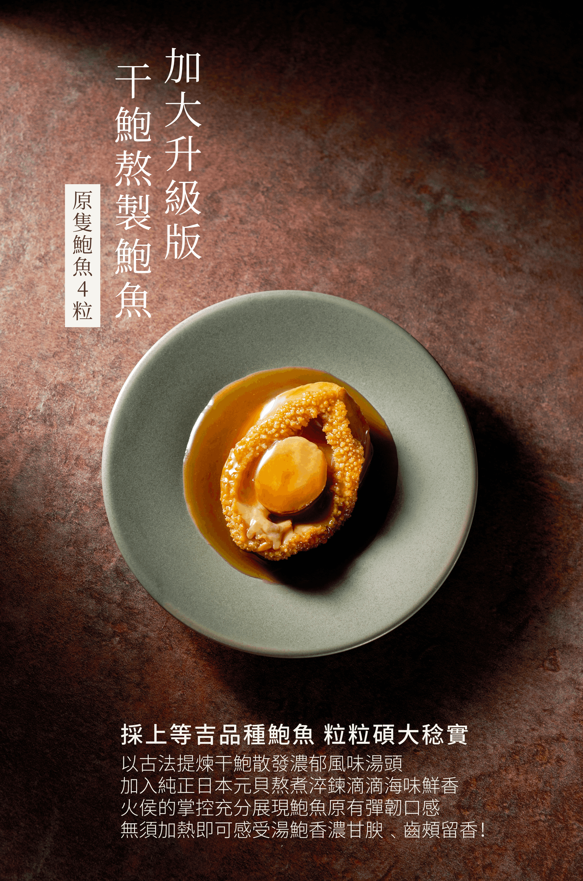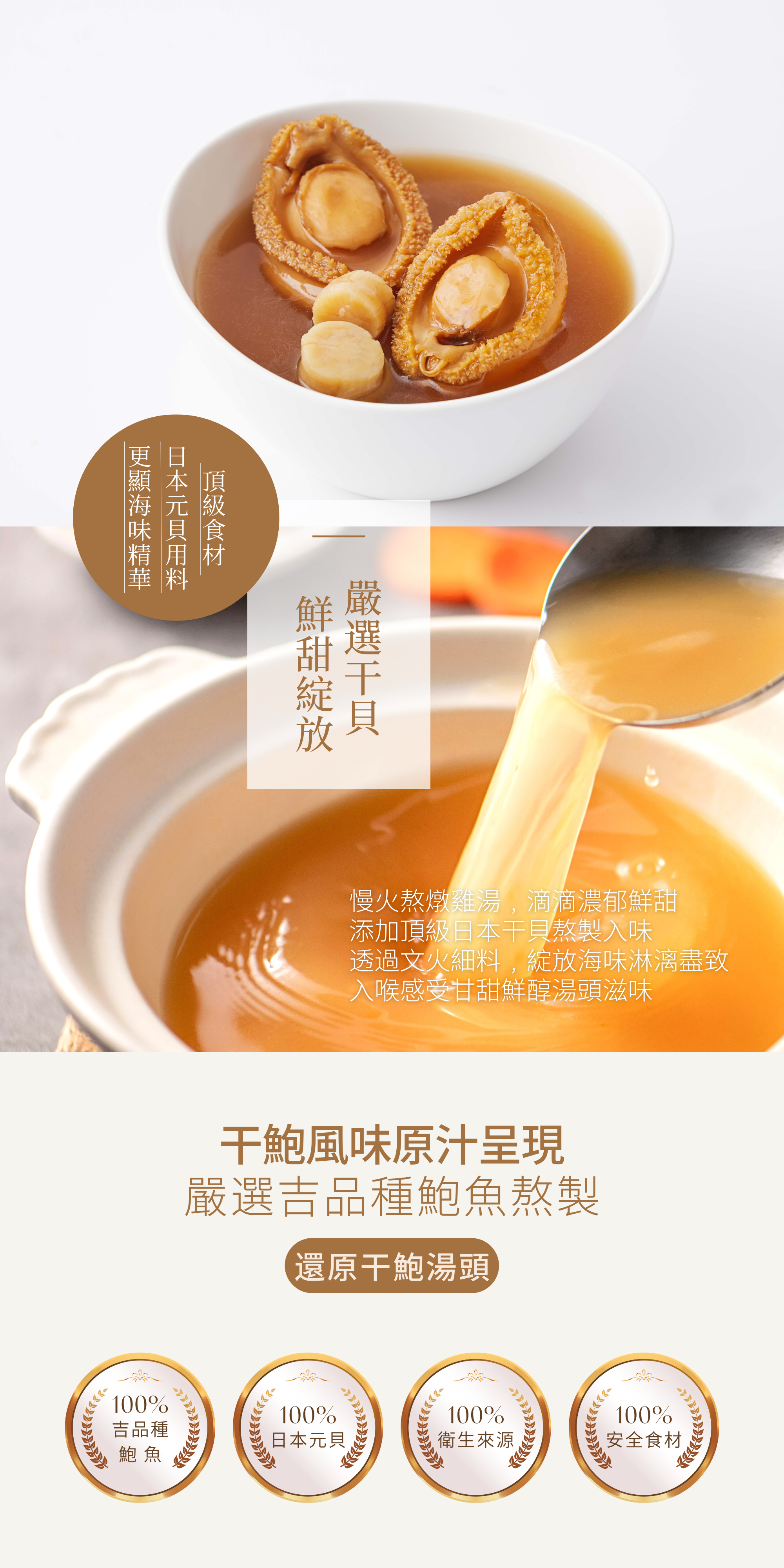 .鮑魚干貝燉雞:挑選厚身扎實鮑魚、日本元貝、嫩滑翅腿肉及爽脆木耳以慢火熬製而成,選用原隻鮑魚入煮,口感 Q 彈有嚼勁,翅腿肉經熬燉後入口即化,搭配日本元貝提升湯頭鮮美甘甜,添加數朵黑木耳豐富口感,湯汁滴滴濃郁鮮甜,入喉鮮醇溫潤,加熱食用,四季皆宜。