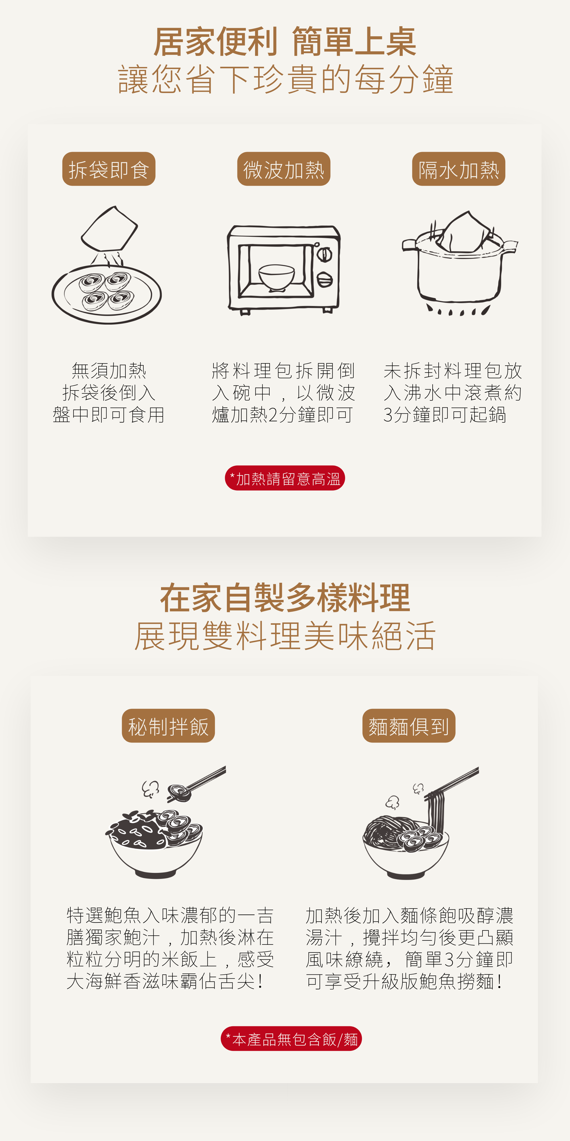 ▎每組含鮑魚干貝燉雞1盒500g (含4粒鮑魚、2支翅腿肉)+干鮑熬製鮑魚1盒200gx2包(含4粒鮑魚),附贈品牌提袋乙個