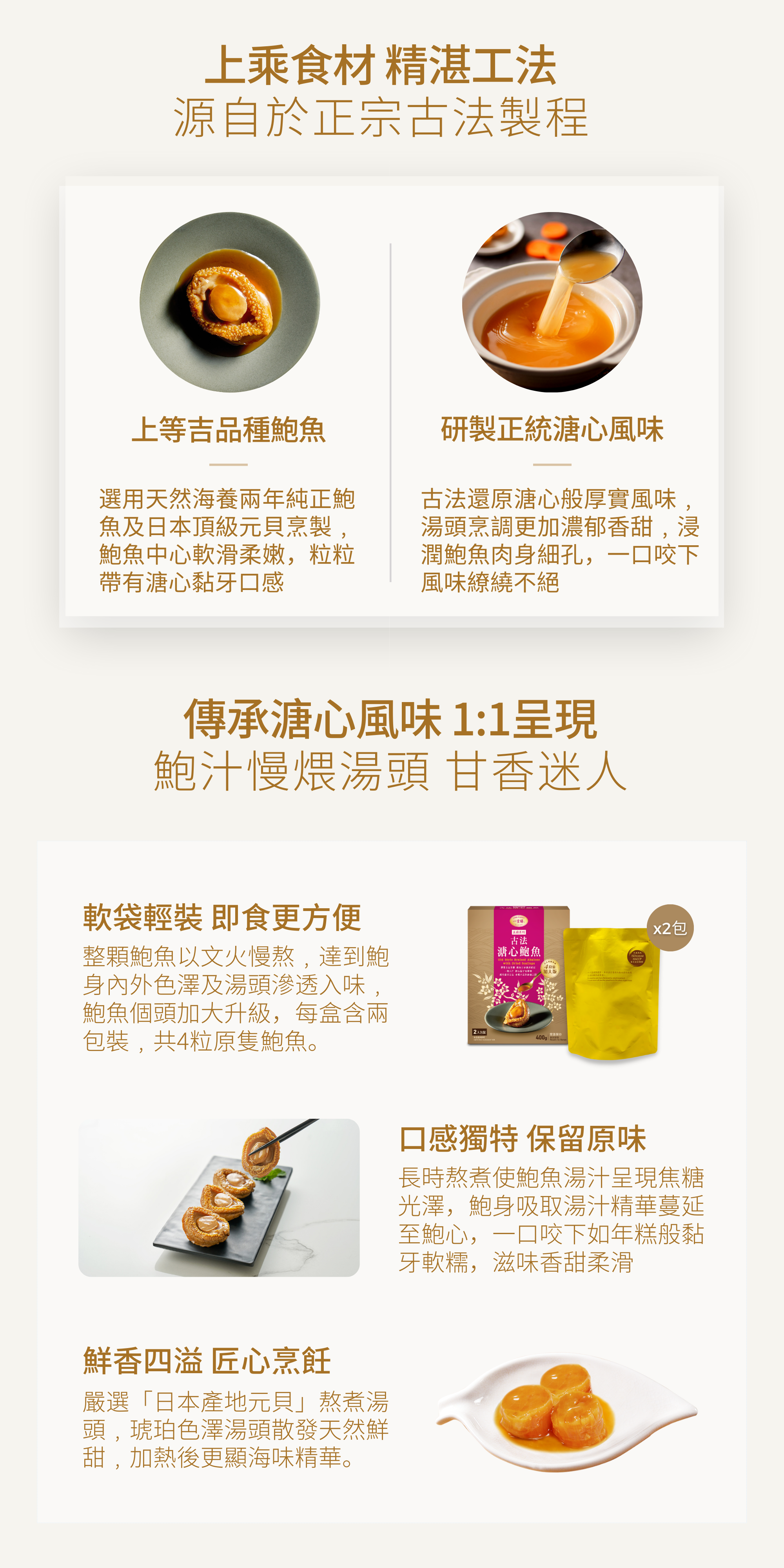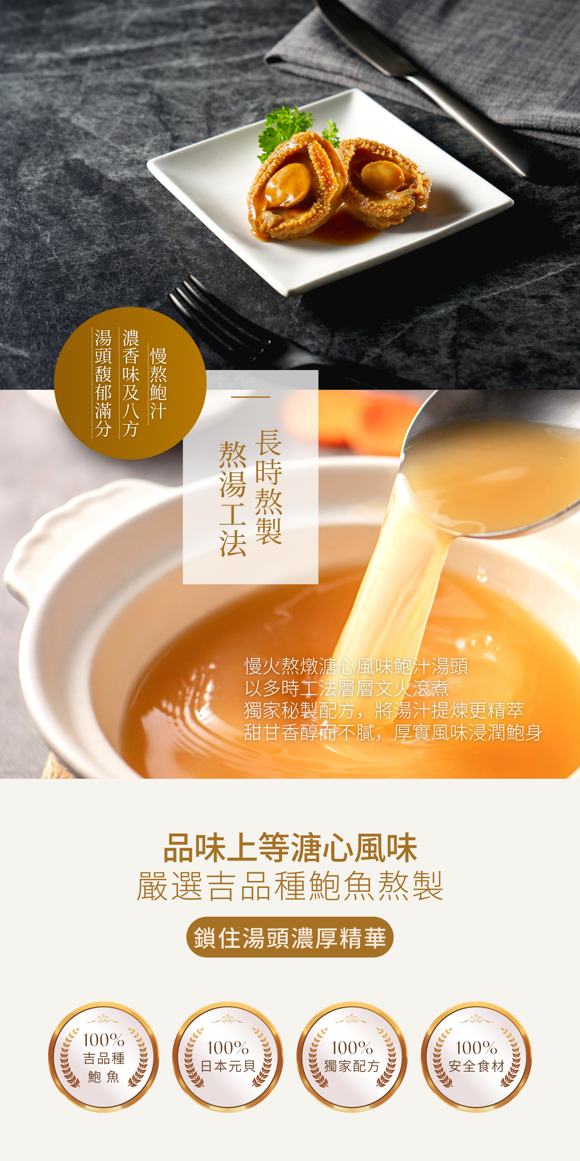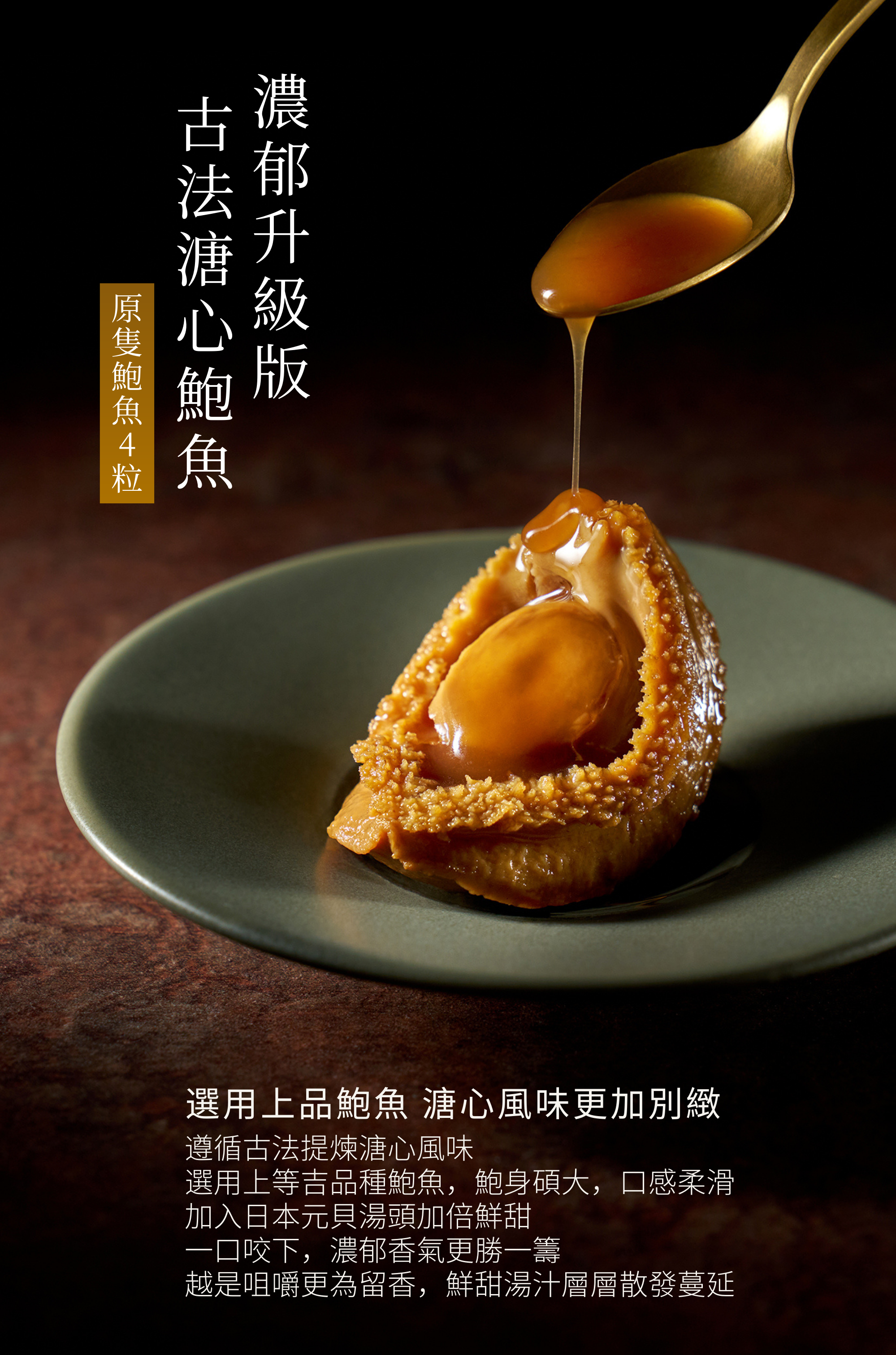 .鮑魚干貝燉雞:挑選厚身扎實鮑魚、日本元貝、嫩滑翅腿肉及爽脆木耳以慢火熬製而成,選用原隻鮑魚入煮,口感 Q 彈有嚼勁,翅腿肉經熬燉後入口即化,搭配日本元貝提升湯頭鮮美甘甜,添加數朵黑木耳豐富口感,湯汁滴滴濃郁鮮甜,入喉鮮醇溫潤,加熱食用,四季皆宜。