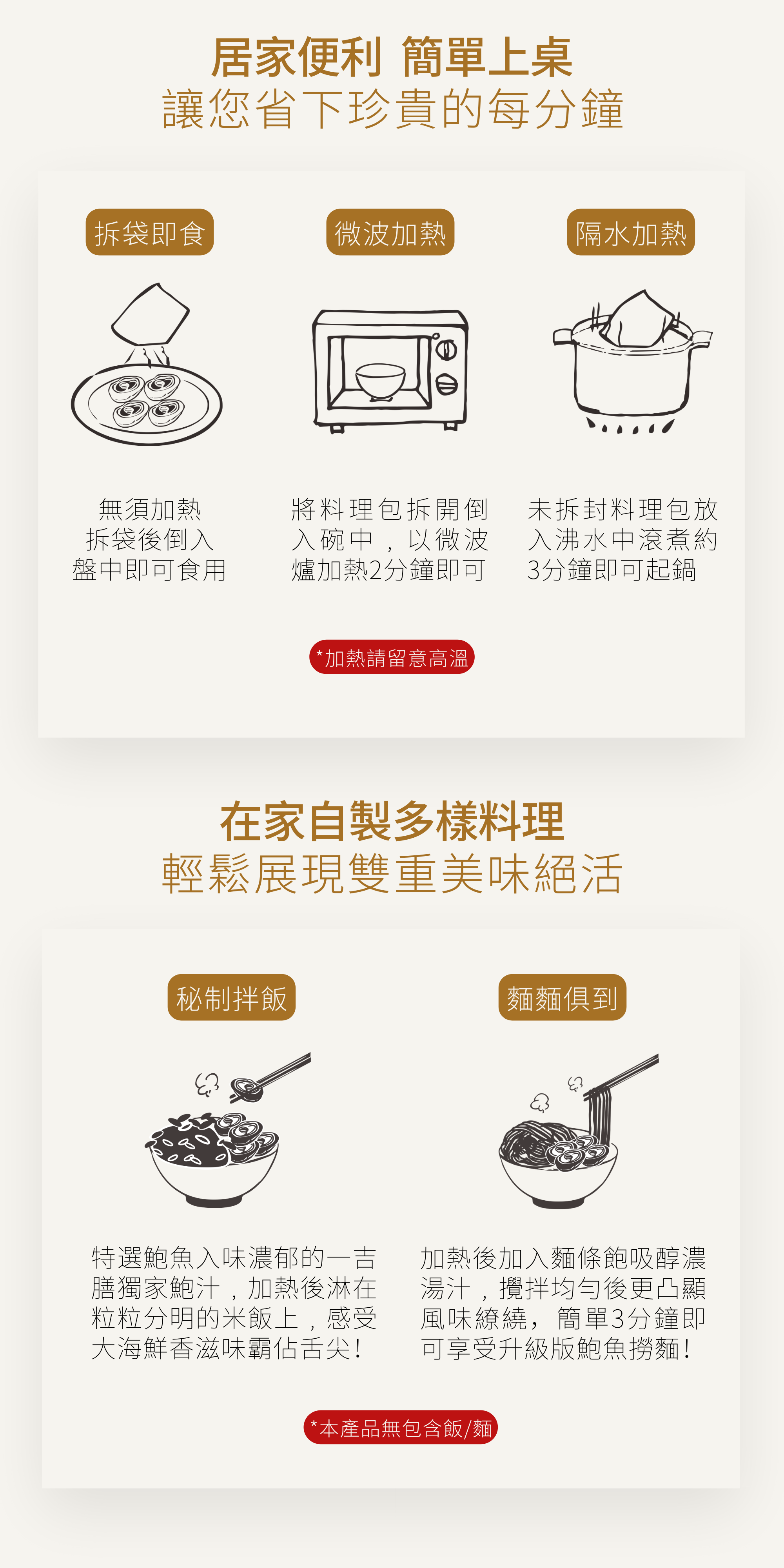 ▎每組含鮑魚干貝燉雞1盒500g (含4粒鮑魚、2支翅腿肉)+古法溏心鮑魚1盒200gx2包(含4粒鮑魚),附贈品牌提袋乙個